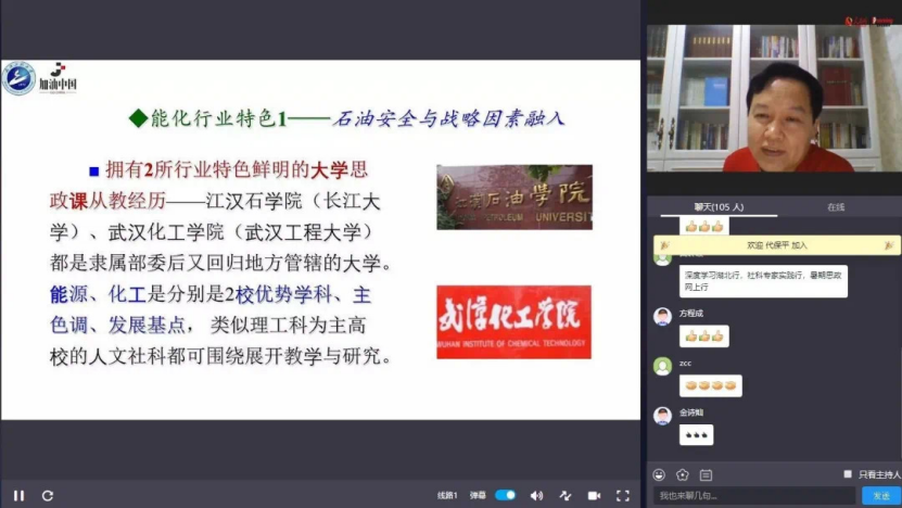 之后,,,,,,,,舒先林教授讲述了“加油中国”以能源化工为基点的课程特色,,,,,,,,即在课程中融入石油安全与战术成分以及核能、生物能、煤炭清洁利用等内容。。。。。。最后,,,,,,,,他综合与总结了其他高校将行业特色融入思政课的课程经验。。。。。。