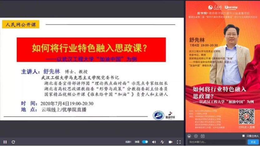 2020年7月4日晚,,,,,,,,由长江大学JDB电子官网主办 ,,,,,,,,人民网公开课协办,,,,,,,,华中科技大学JDB电子官网、湖北经济学院JDB电子官网、JDB电子官网、湖北科技学院JDB电子官网、黄岭峻工作室及文华在线教育六家单元承办的湖北省第二届“新时期高校思政金课建设”钻研与互换周系列活动之湖北高校“中国系劣妆思政选建课第四次专题讲座以人民网公开课的方式成功进杏祝。。。。。本次讲座的主讲报答JDB电子官网党委书记、国度精品视频公开课《谁来给中国“加油”——中国石油安全的困境与前途》主讲人、“加油中国”课程掌管人舒先林教授,,,,,,,,讲座主题为“若何将行业特色融入思政课?????——以武汉工程大学‘加油中国’为例”。。。。。。