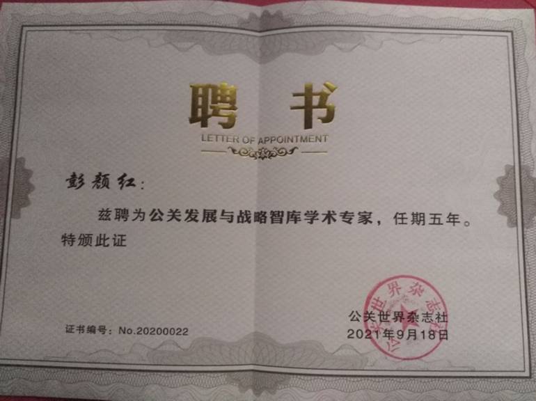 (通讯员蔡明广)近日,,,,,,,《公关世界》给马院副教授彭颜红博士发来聘书,,,,,,,礼聘彭颜红博士为公关发展与战术智库学术专家。。。。。