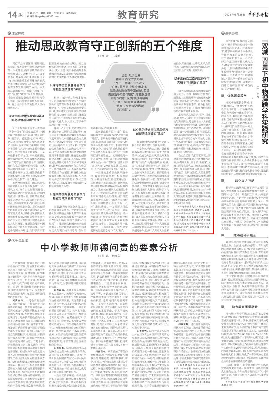 本网讯(通讯员 余澄)6月25日,,,,,我院余澄教员的理论文章《推动思政教育守正创新的五个维度》在《中国老师报》刊发。。。。。。。文章从思政教育的“高度”“深度”“广度”“温度”“跨度”五个维度切入,,,,,系统论述了高质量思想政治教育守正创新的蹊径:提升政治导向的“高度”、厚植爱国情怀的“深度”、拓宽思政内容的“广度”、创新情境履历的“温度”、突破进建场域的“跨度”,,,,,旨在援手学生把握时期脉搏,,,,,拓展视野格局,,,,,深刻理解中华民族从站起来、富起来到强起来伟大飞跃蕴含的汗青逻辑、理论逻辑与实际逻辑,,,,,加强听党话、跟党走的思想自觉和行动自觉,,,,,从而落实立德树人底子工作,,,,,着力造就担任民族回复大任的时期新人。。。。。。。