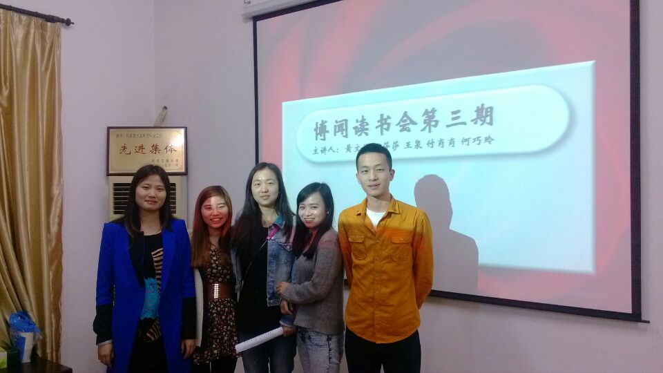 2014年4月23日,,,,,,,,JDB电子官网“博闻”想书会在学院会议室顺利进杏祝。。。。。。本期想书会由我院学生会主席刘存地、学术部部长付肖肖主持,,,,,,,,组织学院钻研生积极参加。。。。。。。本次想书会的主讲人别离是谢莎莎、王泉、黄文娟、何巧玲、付肖肖,,,,,,,,五位同学以“选择绿色生涯,,,,,,,,握别十面‘霾’伏”为主题,,,,,,,,别离作了杰出活泼的汇报。。。。。。。