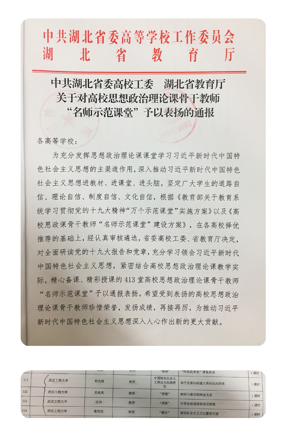 日前,,,,,,中共湖北省委高校工委、湖北省教育厅印发了《关于对高校思想政治理论课骨干老师“名师示范讲堂”予以表彰的传递》,,,,,,我院有4位老师讲授的4堂课成功入选“名师示范讲堂”并受到赞美。。。。。。。它们别离是:舒先林教授讲授的《和平发展与构建人类命运共同体》、吴秋凤教授讲授的《物质与意识的辩证关系》、汪洪教授讲授的《对革命新路路的艰苦索求》、覃凤英教授讲授的《推动社会主义文化繁华兴盛》。。。。。。。